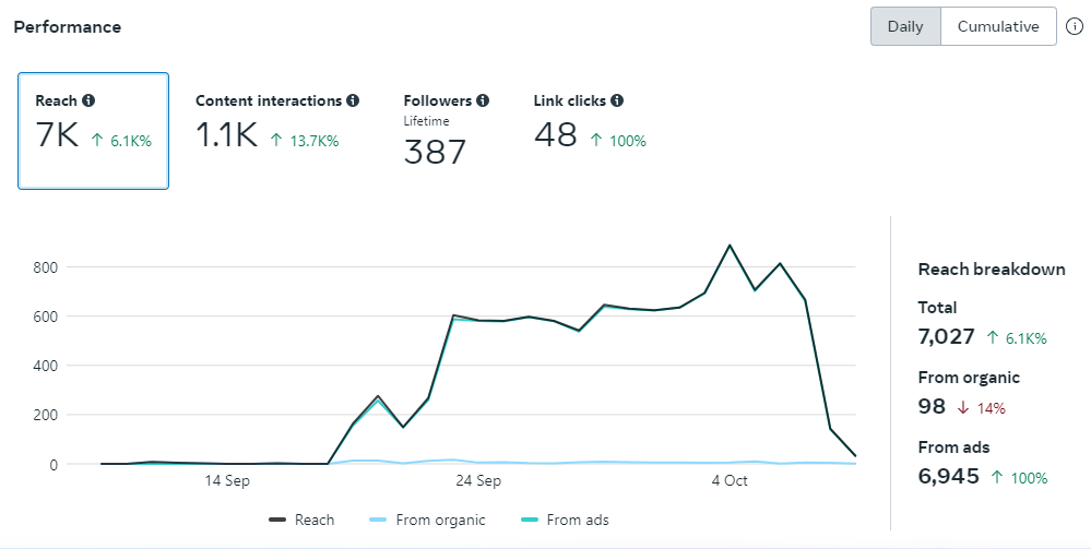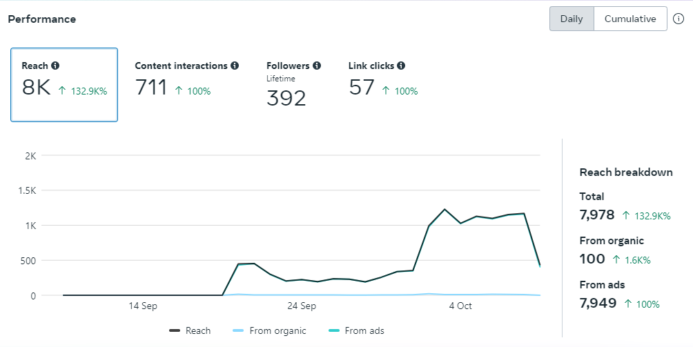 From September to October 2024, there was a substantial increase across all key metrics. Total reach increased by 132.9K%, reflecting improved visibility and awareness. Interactions increased by 100%, with interactive content driving substantial engagement throughout the campaign. Additionally, organic engagements increased by 1,600%.